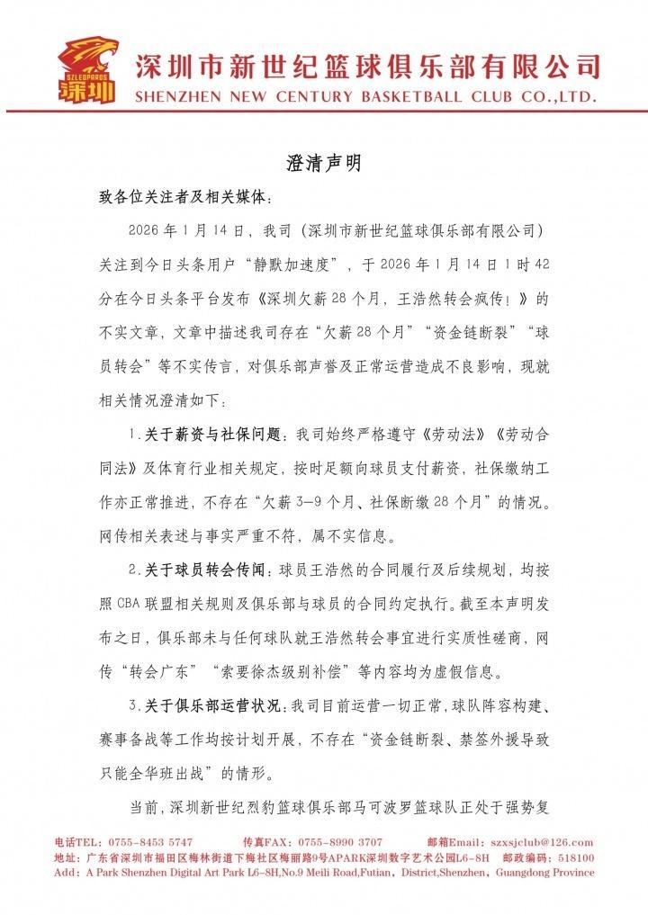 如今深圳男篮官方发布公告进行辟谣,原因是2026年1月14日,深圳市新世纪篮球俱乐部有限公司关注到某自媒体用户“静默加速度”,于2026年1月14日1时42分发布《深圳欠薪28个月,王浩然转会疯传!》的不实文章,文章中描述深圳男篮存在“欠薪28个月”、“资金链断裂”、“球员转会”等不实传言,对俱乐部声誉及正常运营造成不良影响。